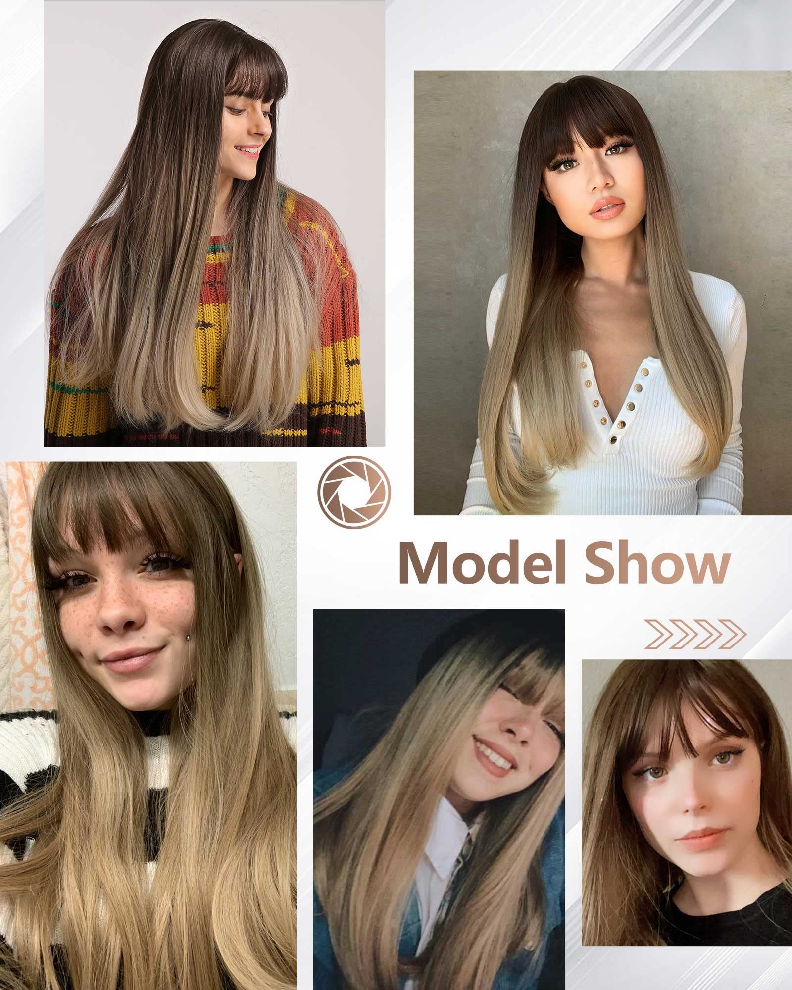 Amazon Com Topwigy Women Brunette Wig Long Straight Synthetic Blonde Wigs With Bangs Ombre Brown To Blonde Natural Look Realistic Dark Roots Wig 24 Inches For Halloween Party Daily Use Clothing Shoes